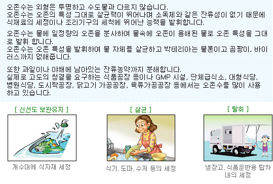 ¶ÇÇÑ ½Ä´ç, È£ÅÚ, ·¹½ºÅä¶ûÀÇ Á¢°´¾÷¼Ò¿¡¼µµ ½ÄÀç·áÀÇ »ì±Õ¼¼Ã´, ³ó¾àÁ¦°Å, ÇàÁÖ, µµ¸¶, Ä®, ½Ä±âµîÀÇ ÁÖ¹æ¿ëǰÀÇ »ì±Õ°ú ¼Òµ¶, ±×¸®°í ½ÄŹ, Å×À̺í, ½Ä±â·ù ¹× »ý¼öÅë ³»ºÎÀÇ »ì±Õ ¼Òµ¶À» À§ÇÏ¿© ¿ÀÁ¸¼ö¸¦ ¸¹ÀÌ »ç¿ë Çϰí ÀÖÀ¸¸ç ƯÈ÷ Çϼö±¸ÀÇ ¾ÇÃëÁ¦°Å¿¡ ¸¹ÀÌ È¿°ú¸¦ º¸°í ÀÖ½À´Ï´Ù.